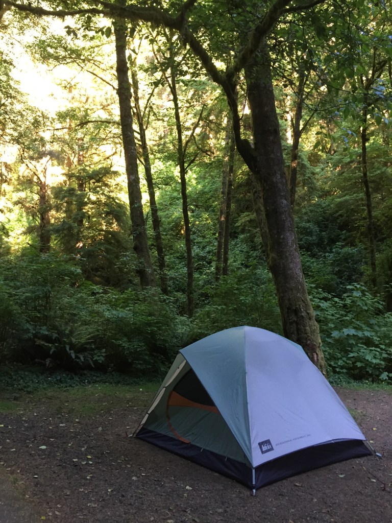 High tide peaked at around 8 pm on Saturday, so we had time to go to the campground in the Siuslaw National Forest and set up our tent for the night before going to see the Well. I’d highly recommend the Rock Creek Campground if you’re ever looking for something in the area. It was small and lovely, tucked among the trees and up against the eponymous creek, with frankly the cleanest and least odiferous toilets I’ve ever had the pleasure to run across at a campground. Two thumbs up!