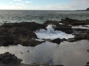 My lack of enthusiasm may have been because B and I had passed by the Spouting Horn on our way to Thor’s Well (it’s a few hundred meters further up the coast). Now thatwas cool! It’s a horizontal, V-shaped slot in the basalt, which at its apex is further hollowed out underneath the top layer of rock (I think – couldn’t see at high tide), and so every time a wave comes up the V, there’s a two-stage spout – with two distinct angles of spouting – accompanied by two different fwooming sounds. The first part of the spout shoots back out towards the ocean, while the second shoots straight up in the air, sometimes higher than the heads of hapless bystanders. I particularly enjoyed a small tide pool just past the edge of the rock, full of sea anemones just hanging out, doing their anemone thing while their home shook and thundered around them.