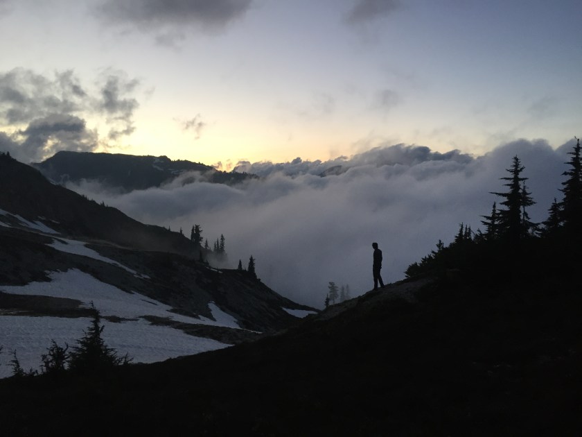 By the time sunset started to roll around, the bugs had mostly gone away for the evening. We had been watching the weather shift from inside the tent – seeing the mist billow up on both sides of the ridge, then eddy away – and now we got out of the tent both to put our food/aromatics into the bear locker, and to take some photos. Then we got back in the tent, read for a bit, and went to sleep.