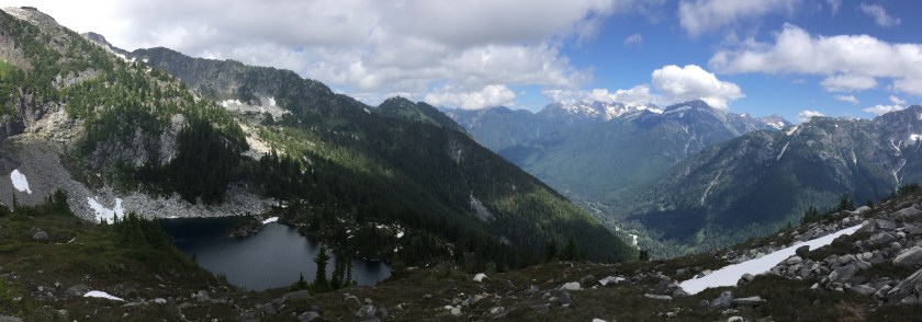 Whatcom camp was mosquito city. The air was literally blurry with them. It was f***ing miserable. We sat for a minute to catch our breath before the last push up to the pass itself (Whatcom camp is a little below the pass), but were soon driven to move on. It was more or less okay while we were moving, but once we got to the pass, where we would have liked to have stopped and enjoyed the view into the heart of the park… bleah. We basically just took a few photos – I found it hard to get any that didn’t have bugs in front of the lens, no joke – and then got the hell out of there. As we lost altitude we lost the bugs too, and by the time we got back to Graybeal we only had one or two.
