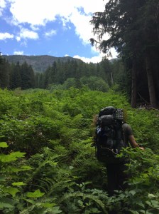 Getting back down into the Chilliwack river valley brought us into lush shrubbery. There were miles where the trail was barely discernable under our feet – where pathfinding was more about sensing our way forward by finding the path of least resistance with our toes, rather than actually being able to see where the trail went. When we reached a creek crossing we stopped for breakfast, since it was the first clear space we’d come to since leaving camp a couple of miles previously. And here we reached B’s psychological low point for the trip.