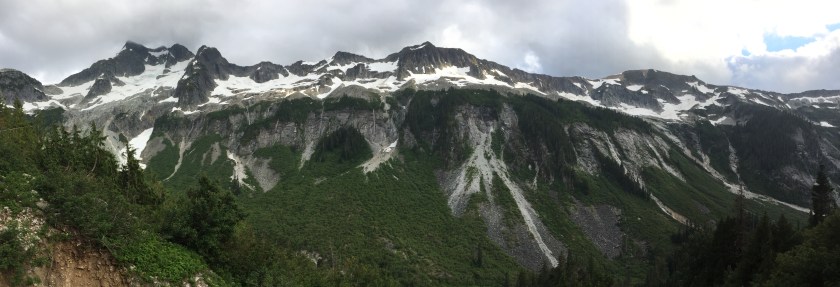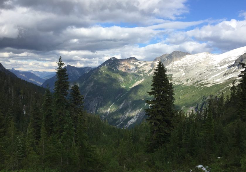 The path from the trailhead to Hannegan Pass runs a long, slow incline up and along the north side of a lovely valley, until it takes an abrupt turn at the pass itself, heading into some steep switchbacks down to the national forest/national park boundary, at which point the view ahead of you also abruptly opens and you get your first look at the mountains and valleys beyond. The only downside with this gentle entry into our hike was the bugs. I got my first experience with blackflies, and… I’m not very good at dealing with blackflies. It turns out.