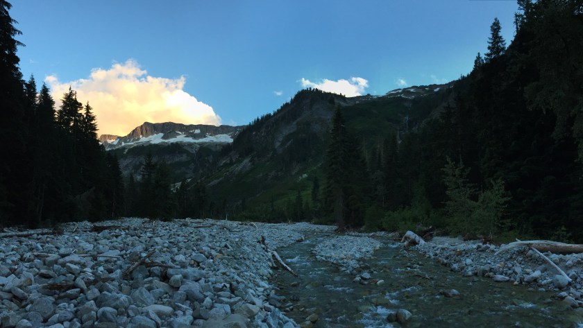 We made dinner and got ready for the night, and I went out to the creek and enjoyed the sunset views back up the valley towards Whatcom. Then we crashed hard.