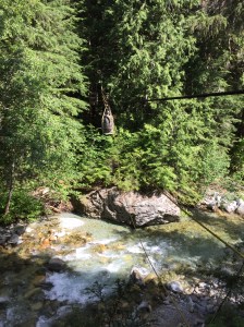 So far, high place, high points, right? Well, then things got interesting. Once you round the top of Copper Ridge and start to head east, you also start to head down. And down and down and down. The trail plummets over the course of 13 switchbacks, down to the Chilliwack River below. By switchback 9 or so we were looking forward to the upcoming “enforced icing” of our knees. Enforced, because once you get to the bottom of the switchbacks, you have a pair of river crossings. The first one was only ankle-deep, but the water was cold enough that my feet were tear-inducingly painful within about ten seconds. For the second crossing, by searching around for a good place (which involved pushing our way through some devil’s club), we were able to drop in from a huge tree that had fallen along the bank, whose massive root system upstream worked to slow the river through the deepest part of our ford. Despite all that, and despite that the deepest part was only about six or seven feet wide, six or seven feet of hip-deep snowmelt was plenty enough. Unfortunately, that was followed by a further forty-odd feet of ankle-deep diagonal crossing to get back to where it looked like the trail continued on the other side.